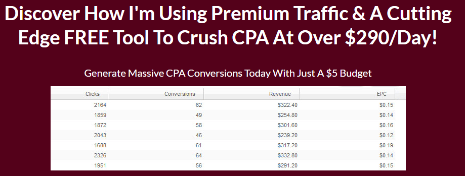 By using a powerful and unique untapped traffic strategy along with a free cutting edge tool available to anyone, I have been able to launch and run super profitable CPA campaigns with ridiculously low ad spend and minimal time needed to set up and scale high.